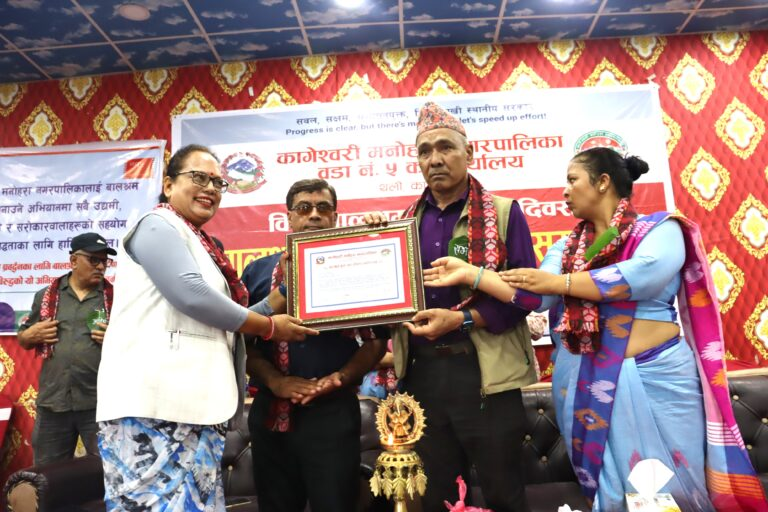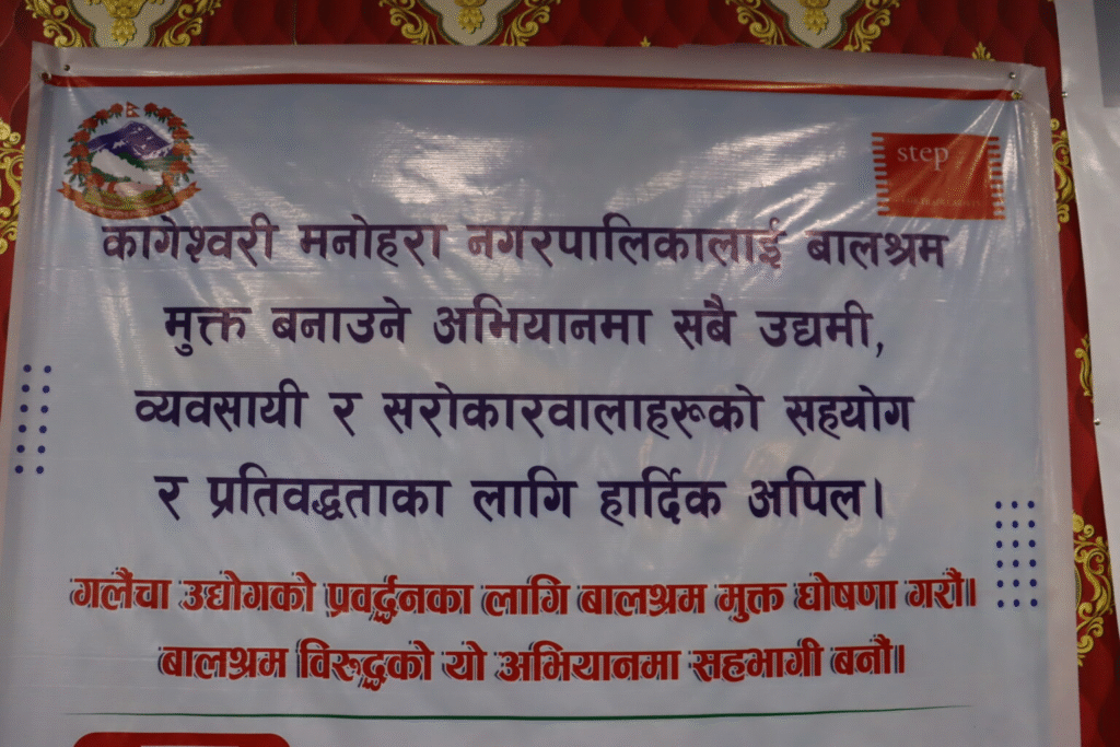 काठमाठौ- कागेश्वरी मनोहरा नगरपालिका बालश्रममुक्त समाज निर्माणको अभियानमा सक्रिय रूपमा जुटिरहेको छ। नगरका विभिन्न वडामा चरणबद्ध रूपमा बालश्रममुक्त घोषणा भइरहेको छ । नगरपालिकालाई आगामी दुई वर्षभित्र पूर्ण रूपमा बालश्रममुक्त बनाउने लक्ष्यसहित काम अघि बढिरहेको छ । बालश्रम अन्त्यका लागि अनुगमन र जनचेतनामूलक कार्यक्रमलाई निरन्तरता दिईरहेको नगरप्रमुख उपेन्द्र कार्कीले बताउनु भयो ।