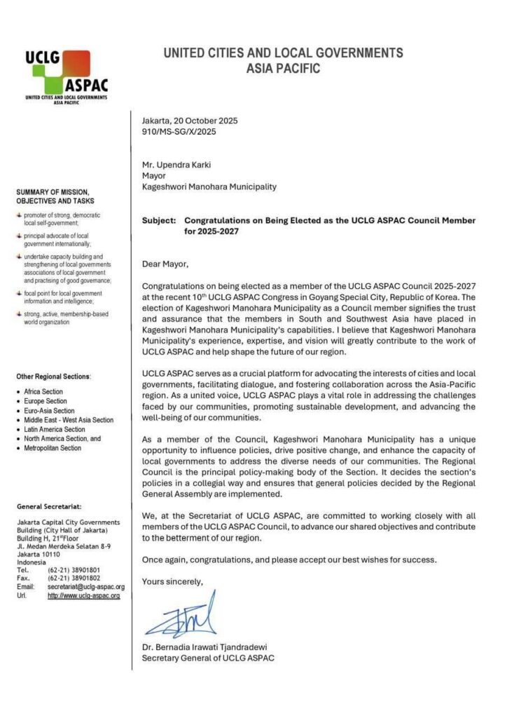 म संयुक्त शहर तथा स्थानीय सरकार एशिया–प्रशान्त (UCLG ASPAC) को २०२५–२०२७ कार्यकालका लागि परिषद् सदस्यमा निर्वाचित हुन पाउँदा अत्यन्त गौरवान्वित र विनम्र महसुस गरिरहेको छु।