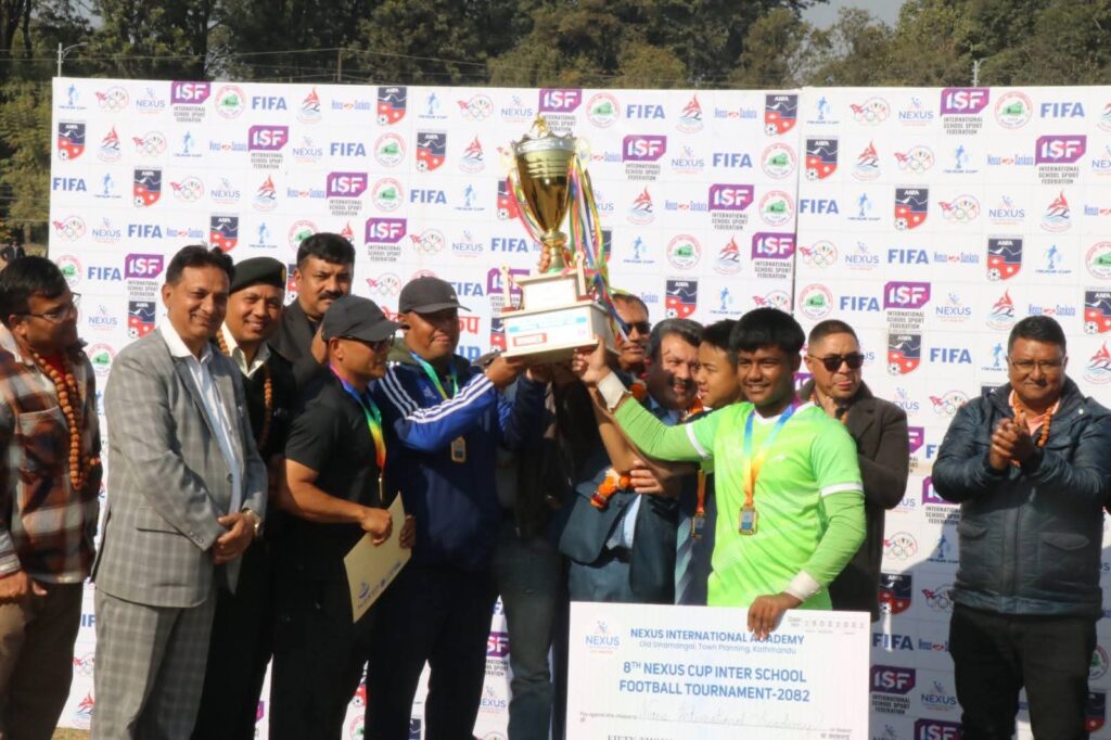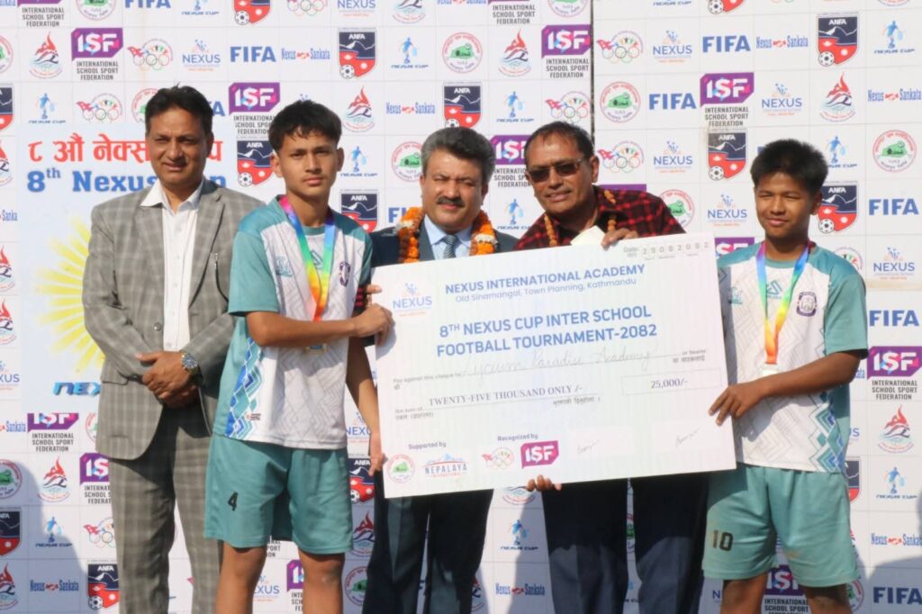 आठौँ संस्करणको नेक्सस् कप २०८२ सफलतापूर्वक सम्पन्न भएको छ। सोमबार मध्यपुर युथ एसोसिएसनको खेल मैदानमा सम्पन्न फाइनल खेलमा आयोजक विद्यालय नेक्सस् इन्टरनेशनल एकेडेमीले लाइसियम प्याराडाइज एकेडेमीलाई २–० गोल अन्तरले पराजित गर्दै उपाधि जित्न सफल भएको हो। पराजित लाइसियम प्याराडाइज एकेडेमी फस्ट रनर–अपमा सीमित भयो।