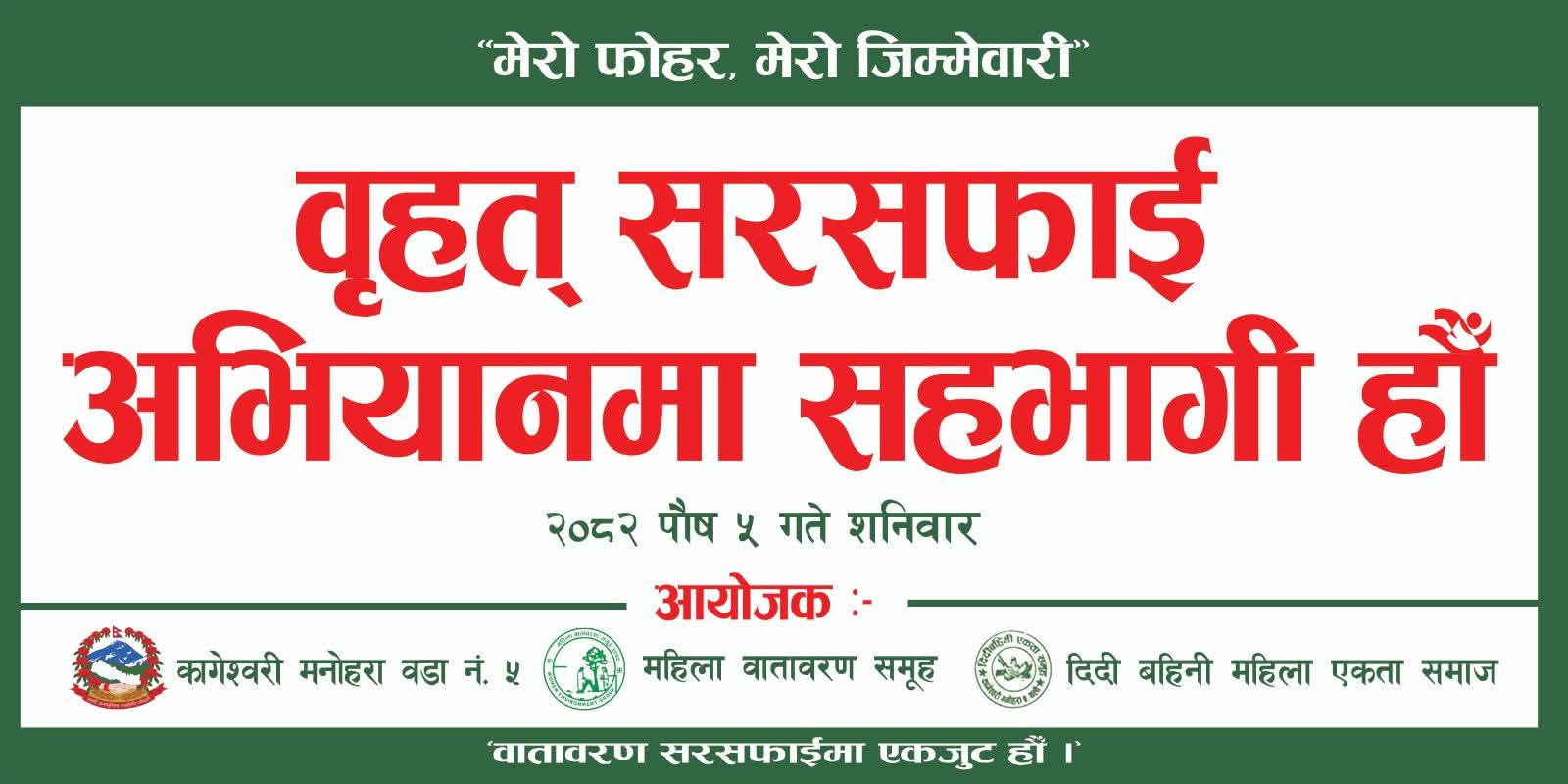 थली, ४ पुस : “मेरो फोहर, मेरो जिम्मेवारी” भन्ने मूल नाराका साथ कागेश्वरी मनोहरा नगरपालिका वडा नं. ५ द्वारा भोलि शनिबार बिहान ७:३० बजे वृहत सरसफाइ कार्यक्रम आयोजना गरिने भएको
